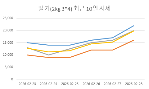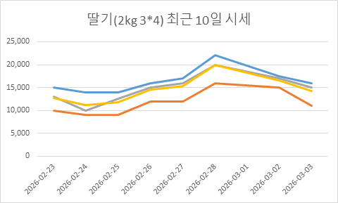 2026년 02월 28일 딸기(2kg 3*4) 시세 리포트 구분 가격(원) 전일대비 최고가 22,000원 ▲ 5,000 최저가 16,000원 ▲ 4,000 최빈가(추천) 20,000원 ▲ 4,000 평균가 19,857원 ▲ 4,607 [경매 상세 내역] 규격/등급/과수 수량 경락가 2kg특3*4 129 22,000… 260228 딸기 테스트
