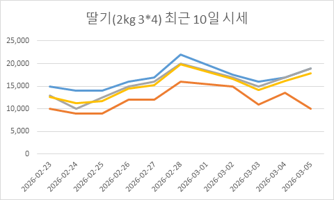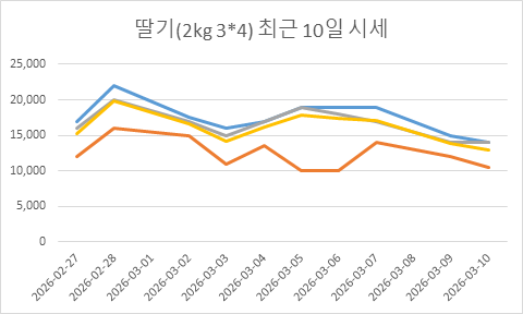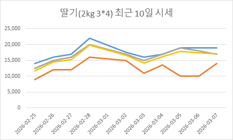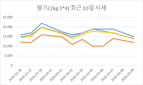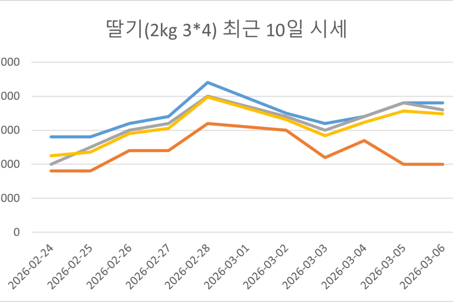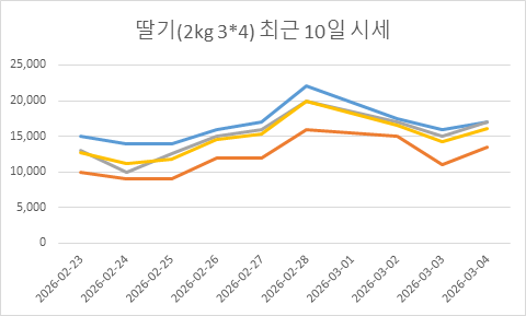 2026년 02월 27일 딸기(2kg 3*4) 시세 리포트 구분 가격(원) 전일대비 최고가 17,000원 ▲ 1,000 최저가 12,000원 – 최빈가(추천) 16,000원 ▲ 1,000 평균가 15,250원 ▲ 750 ※ 본 데이터는 2kg 3*4 규격 전용 경매 시세입니다.